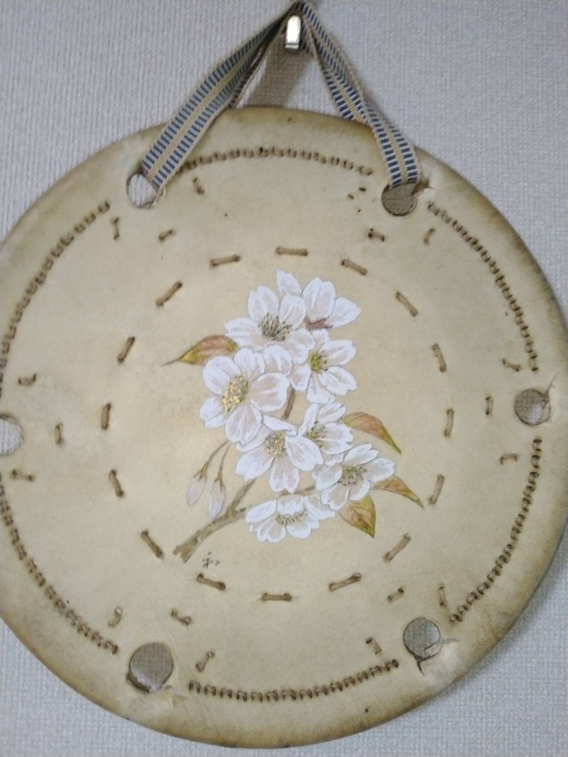 ①使えなくなった大鼓が桜の花で生き返りました。生地は馬の皮です。 |