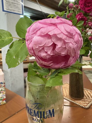 一昨日頭を下げていた多すぎる花びらが重すぎて大変そうなピンクの薔薇。それを善意で身軽にしたらと思ってチョキンと切ってコップに入れてギャラリーに飾った。派手な姿は金持ちの薔薇か。/あっという間に今週も終わった。KSN総会もあったし、ご主人様の早期退院もあり、(結構、口でこき使われて叱られていて、身軽な独身生活におさらばしたのだった)そんな訳で今月は大きく変わった。これからはIさんを偲ぶ冊子作りも力を入れないといけないし、明日はPM8アドバイザー会議、火曜はPM5:30友の会運営委員会、それから水曜日にはKSN水曜サロンだし・・詰まってきてしまった。爺575は”半分の 年月過ぎる 爺時間”・・ああ時間だけが過ぎてゆく。