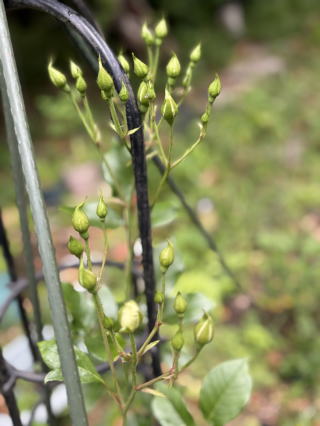 今朝は雲で、雨の予感、草刈りを目標の半分したところで小雨が降り出してやめた。寒い、炬燵に足を入れたりして、その後ご主人様の要望で机運び。一人で抱えるには重すぎる。昔の木工は重いので家の作りは頑丈にしないと床が抜けそうな重さだ。こんな木材を使ったタンスがあの震災の日の寝床を襲った。もしあそこに寝ていたら、この世に居なかったこともちょっと運ぶ重さで、またあの偶然を思いだした。熊本に脱出猫探しに帰って命拾いしたこと。これはあの物語に結びつく。/山小屋の庭には櫂さんから貰ったツタ薔薇の白の蕾みがいっぱい開花準備中だ。