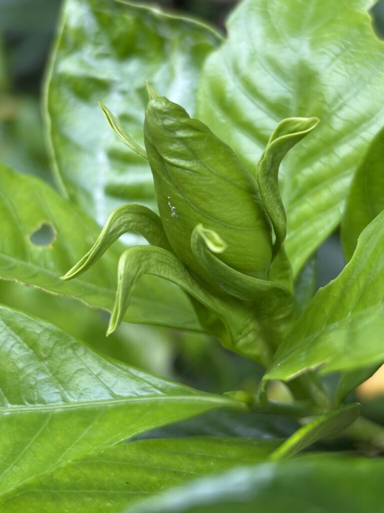 大きめのクチナシの花の蕾みがそろそろ咲きそうだ。小さい方は既に花は枯れて落ちつつある。雨に降られて香りはあまりない。散歩中の猫に嗅がせるが無反応。人間も同様。6月から7月にかけて咲く・・花言葉はとても幸せです(I’m too happy)喜びを運ぶ(transport of joy)洗練(refinement)優雅(elegance)というそうだ。『熟しても割れない果実を「口無し」と呼んだ』ことが由来とネット検索で。私は脅されるとすぐに口を開くから大口有りかな。いろんなことが秘密になかなか出来ないで困っている。我の失敗談で4コマ漫画を描いて貰っているのだからクチナシとは縁遠い。最近その失敗が減ってきたので4コマのネタがほとんどなくなった。何か失敗しなくてはと日々心がけているのだが・・
