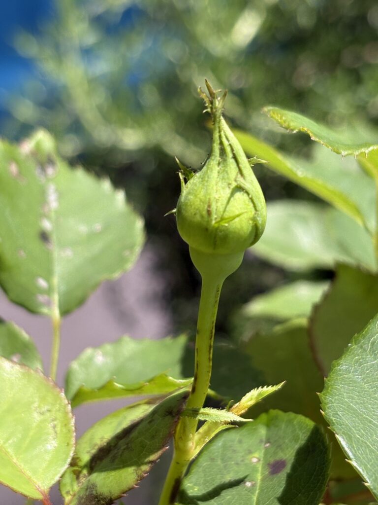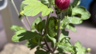 菊の花に刺激を受けたか、隣で、ちょっと前に咲いた白薔薇もつぼみを構えた。暑さにはどうだろうか。
