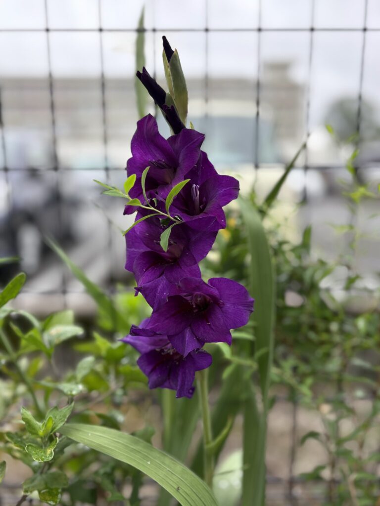昨日は3つだった花が5つ咲いた紫のグラジオラス、花の中に入り込んで邪魔をする雑草。植物の世界も覇権争いのなかにある。