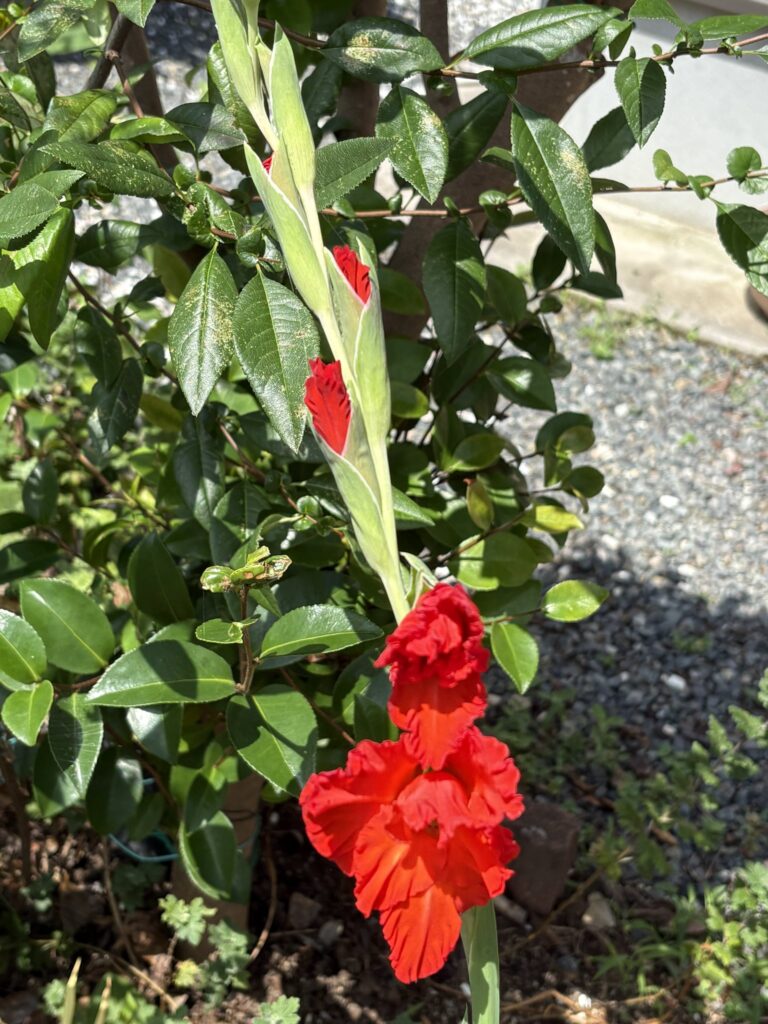 車で山小屋へ移動するときに梅雨が明けたというニュースが流れた。早すぎる。いよいよ夏に突入!いつもより随分早いのではないか。出がけの庭には明日には満開だろうと思える赤いグラジオラスが夏の日を浴びていた。その傍らの赤い菊の花も満開だろうか。これが女の人であれば・・人生は花弁の程に多弁かな などと5月13日の絵手紙教室で書いていた。その絵は赤い薔薇が主人公だったが、こちらは赤い菊、まあどっちも美人だし。(無意味だし(^o^))まあまあ。