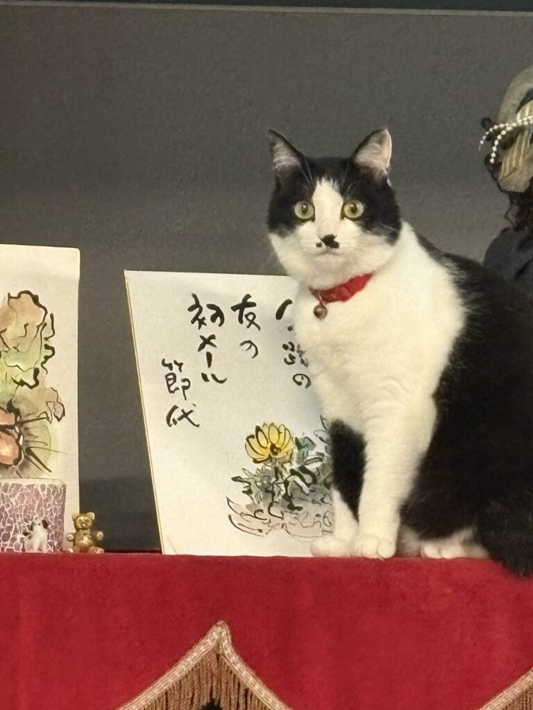 わしゃあこれが気に入ったと。「ありがたき 80路の友の初メール 節代」だって・・・色紙と一緒にどや顔のハナ。ICT(Information and Communication Technology)がよく分かる猫である。
