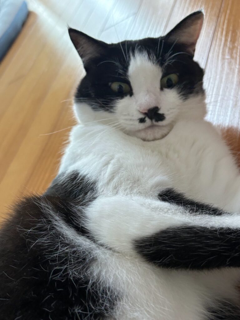 寝そべっていたハナに声かけしたらビックリしてこちらを振り向いた。その後二階で熟睡。転々と場所を変えて寝転んで(猫転んで)いる。