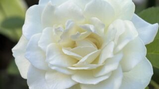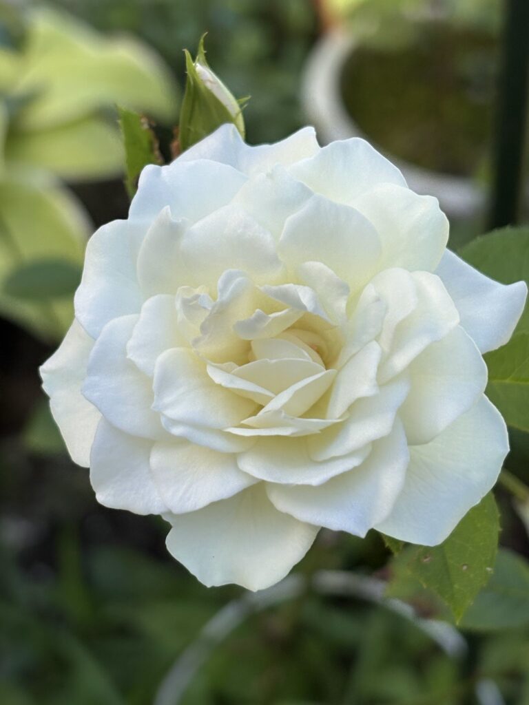 ピンクの薔薇が一日で散ったあとは、白い薔薇が綺麗に開花。昨日の様子からさらに開いた。この姿も最高だ。真夏の暑さには白がよい。