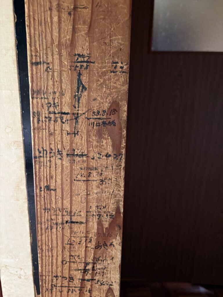 我が実家には大事な柱がある。爺さん婆さんの孫の成長を記録した端だ。他所の子どもの名も見える。あきら、憲一などあったり、ゆうこ、まりこ、博もあったりとごちゃごちゃだ。測ったネンガツピも書かれていて夫々の成長がしっかりたどれる。