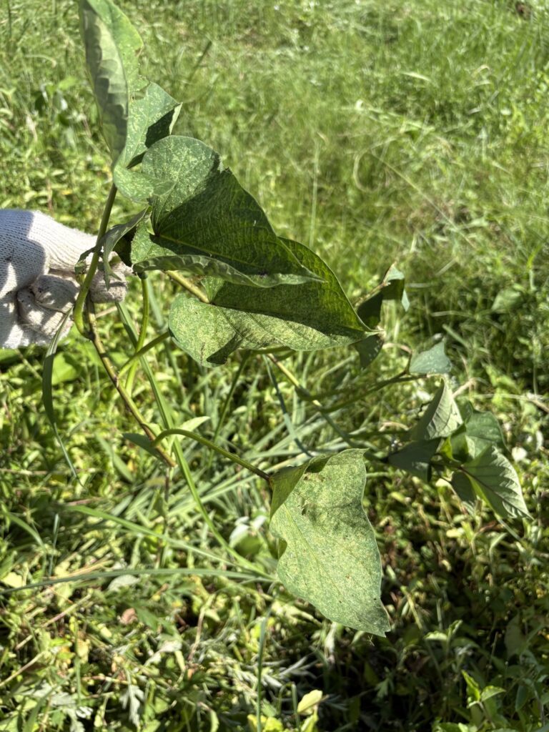 上の段の草原には唐芋を植えているのだが、すっかり草と同化しており、何処に生存しているのか分からず、所々の高い雑草に刈刃を向けたら、なんと一緒に唐芋のつたを切ってしまったのだった。