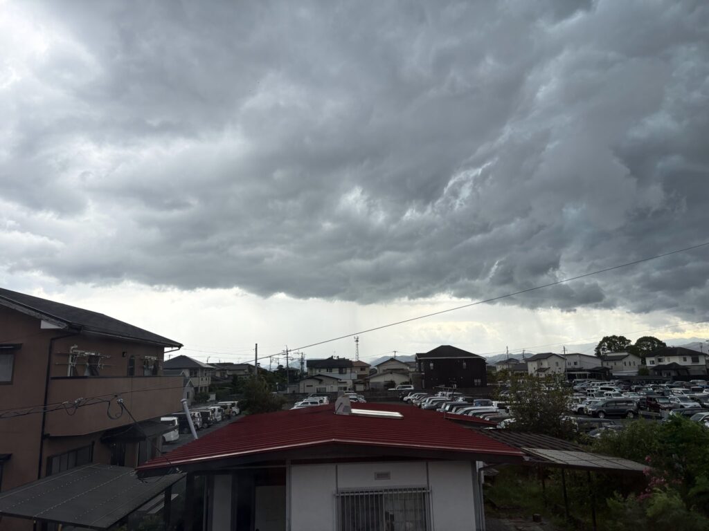 14時突然の風、空には黒い雲。2階の開放している窓を閉め、洗濯物を慌てて取り込んだ。大雨になるかもと知り合いにLINEして1時間もすると雲は北へ去って、西には普賢岳がくっきりみえてきた。空のことなんか知るかと、再びセミが鳴き始めた。猫のハナを雷避難所(階段下)から引っ張りだして、もう大丈夫と伝えたら、板張りで横になっている。