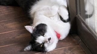 山にきたら夜警は免除。それでこの山小屋では殆どが猫のハナにとっては、睡眠時間。たまに食事とトイレ時間に起きるくらいだ。あとは爺さんの後ろをついて監視役。それと逃げ時を着々と狙っている。爺さんは全然経験が身につかず、よく脱出の機会を作って呉れる。猫にとっては脱出援助者として重宝している。そのためには爺さんが油断するようにと猫のリラックス状態を見せびらかす。これもひよっとすると演出かも(^o^) 目が笑っていない。