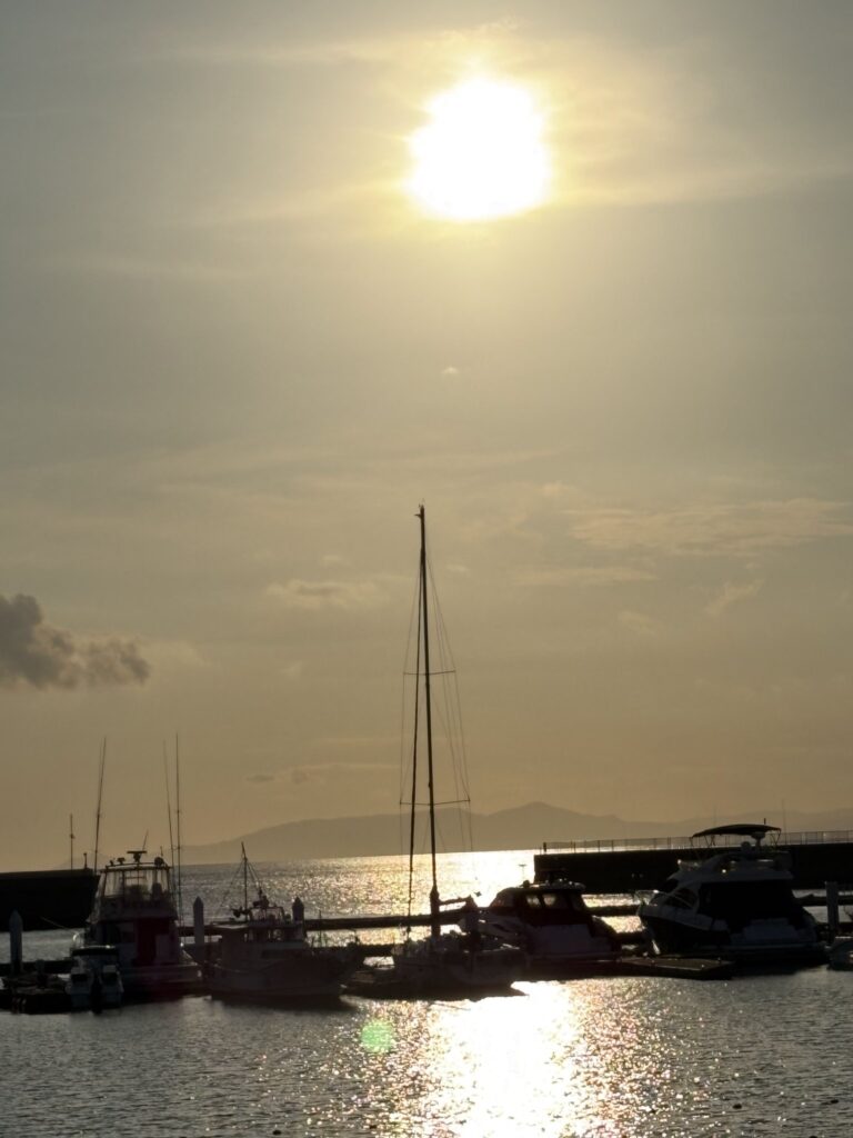最後の目的地で夕陽と船を撮る。ついでに福祉部のLINEへ現地中継写真を送った。対岸の普賢岳は雲に包まれて山頂が望めなかった。堤防をずっと歩いて一番先で、談合島(湯島)の写真を撮る。西風が吹いて気持ちよく歩けた。一度はこんな豪華ヨットを操作して海外遠征をしたかったが、次の人生での楽しみにとっておこう。運転を他人に任せて私はアマチュア無線に専念しようっと。夢は自由だから。(^o^)