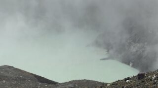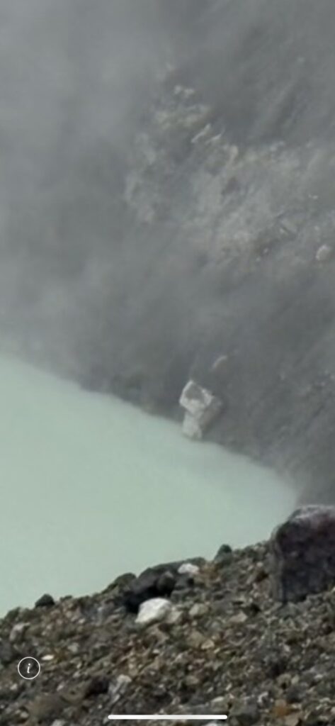 それが、山小屋に帰宅して火口の湯だまりにちょっと気になるところがあって拡大してみると・・あらまあ人が両手を挙げて!っと個人的に大騒ぎ、あっちこちにLINEでどう見える?と・・はよう管理事務所にしらせないと とかの声も。でもこんな火山のエメラルドグリーン熱湯にじっとしておられるはずもない。H2Sだってわんさか発生しているはずだから・・と昨晩の御嶽山アニメを思い出していた。まさにそれを見物していたのは噴火時死亡大多数が居た500mの範囲はおろか、わずか10m火口近傍での撮影だ。