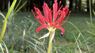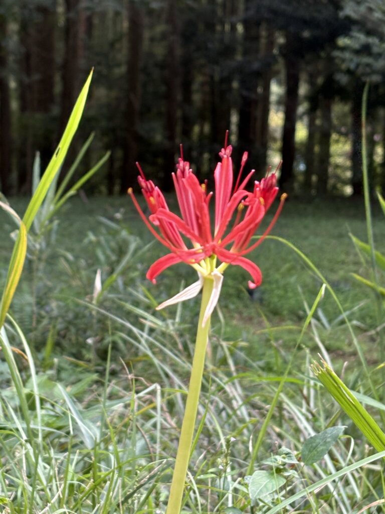 秋分の日・・森の中の彼岸花も出番を間違えずに咲いた。遥か南方の台風のせいか 風がとても強い。栗の木も揺れて、風が吹く度にドスンという毬栗が落ちる音がする。晴天の森の栗拾い中にもわずか出た顔のそばでヤブ蚊が脅かして飛んでいる。