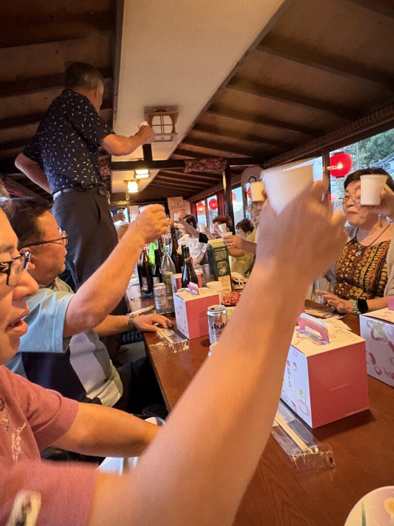 毎年、江津湖の屋形船は楽しみにしていた。申し込みは私が1番だった様子。熊本のオアシスに船出して湖から時々景色を眺め、三味線に太鼓の伴奏の歌を聴きながら26名で飲む酒は美味しい。
