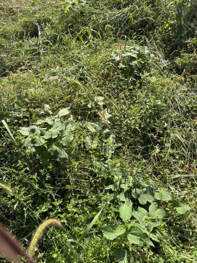 草原の中には唐芋の葉っぱが元気にあった。11月になってから唐芋ホリを予定。たぶん、小指くらいの小さな芋になろうか。