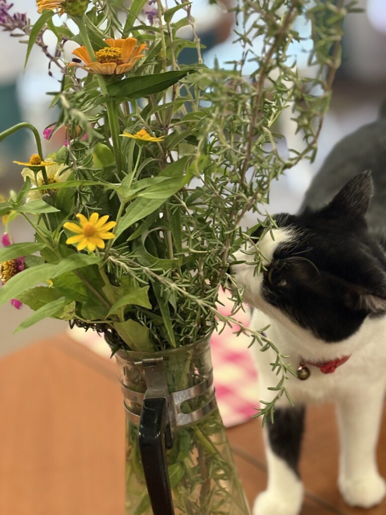 猫のハナは下界では早起きだが山小屋では、夜警がないのに思い切り寝ぼすけだ。最後に起きて、爺さん捜しをしてギャラリーへ降りてきて、さっそく花の香りをかいでいた。脱出の機会を狙っている。