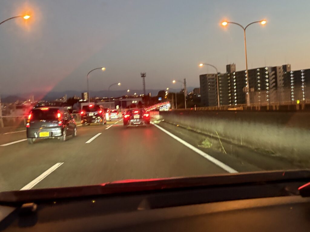 山鹿からの帰り道、助手席なので、好きな写真が撮れるはずなのだが、撮ったのは1枚だけ、田舎の風景が消えて都会の風景に変わるところ。ずらーっとテールランプが連なっている帰宅時間の6時半。