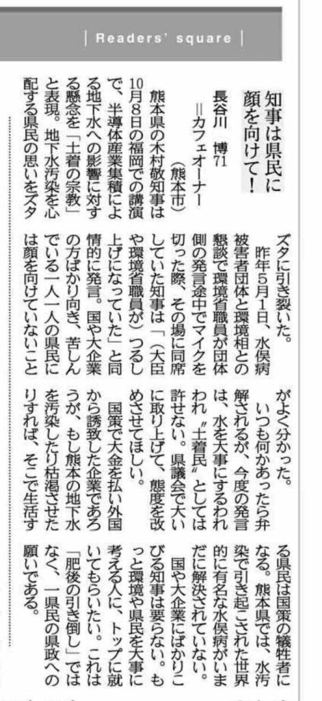 朝 LINEに知人がこの記事を添付してきた。まさかあの怒りの投書を掲載してくれたことに感謝!、我が家は山が3日、市内が3日なので、熊日新聞を取っていないのでこんな紹介は助かる。