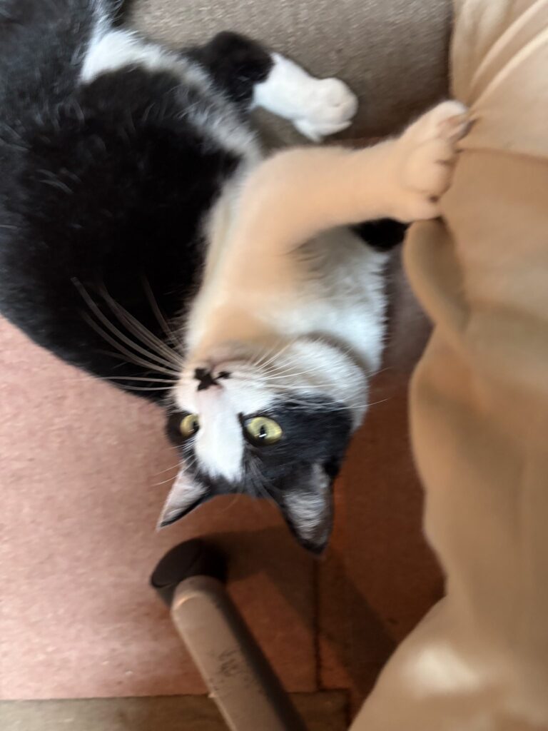 ねえねえ 遊んでくれよ と爪を立てるハナ。時々、喋るのが分かる。ご飯だけじゃすかん。チュール頂戴なんて、最近はやかましい。内弁慶のくせに通りがかりの野良猫には口喧嘩を挑むが、山には野良も現れず、喧嘩相手に虫など探しまわっている。その合間に私をストーカーしている。