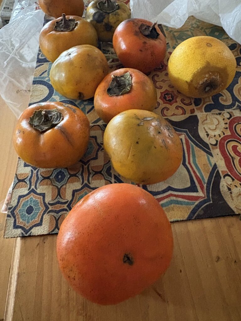 来週28日阿蘇乙姫は4度Cという予想で、まあ吃驚!雪も降りそうな寒さ。今年の冬は寒そうだ。先日月曜に義務的に小川の柿の実ちぎりも終わり、あとは鳥の餌に。ご主人様があちらこちらに譲ってしまって、残りは少ない。今年の豊作にはホントに参った。それに比べて山小屋の柚はゼロ個。