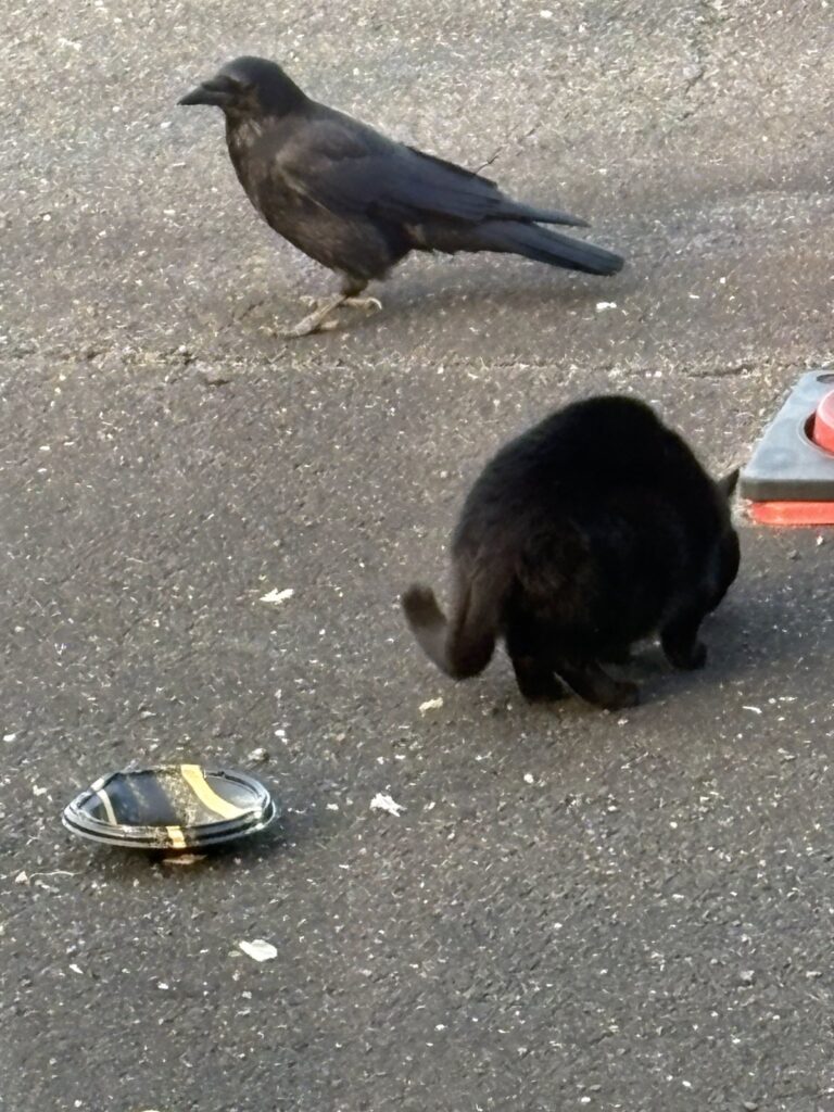 カラスと野良猫は仲良し。一緒に魚の骨を咥えている。我が家のチャメもカラスと友達のようで、家の近くにいると何事か喋っている。なのに同類である野良クロとはいつも喧嘩腰である。種の関係より、異種との相性なのか、猫とカラスは友達というのが何か面白い。猫と猫が横にいたら喧嘩しかないのになあ。