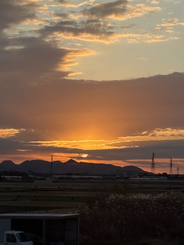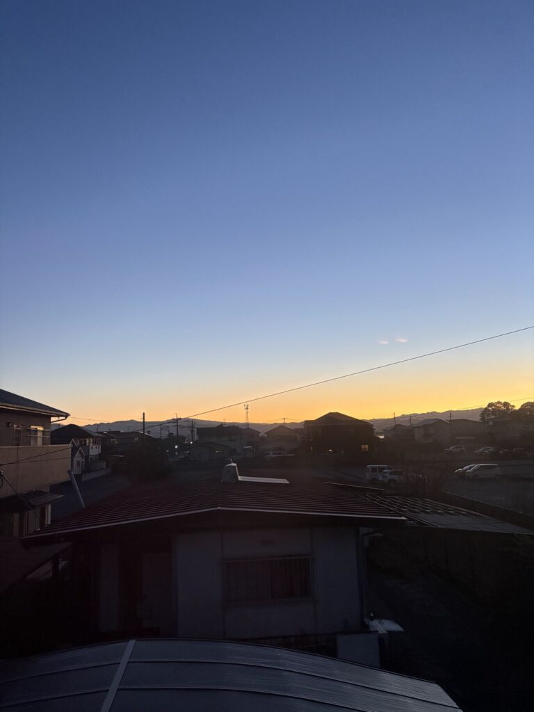 昨日の日没 二階からの西の空。いよいよ陽が長くなるぞとわくわくする。私に文学的な才能があったら短歌や俳句で書きとどめるのだろうけど。何も書けないのでまあ写真で記録しておこうという魂胆なのである。