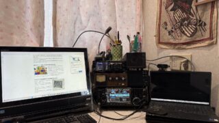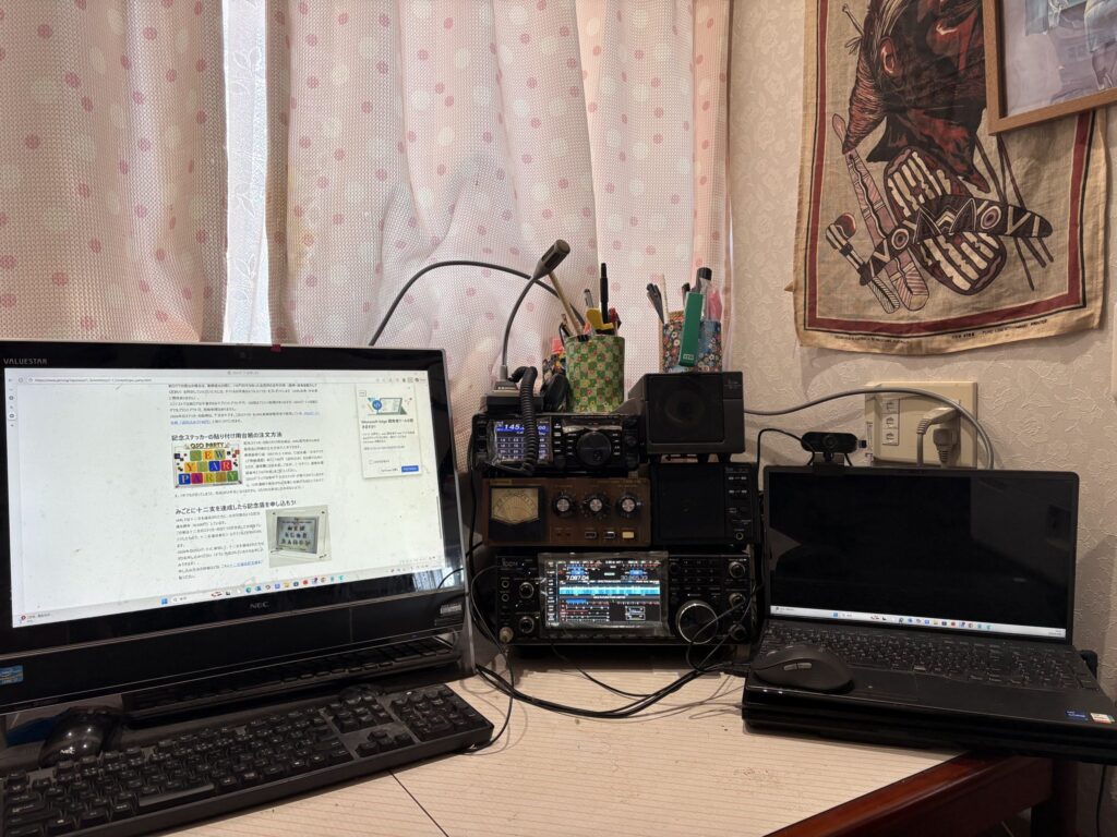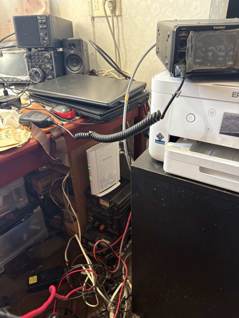 私の頭の中のようにめちゃくちゃな結線。誰にも理解出来ないだろう、そんな机の上下。今日は頑張って、再セットした。大きな装置は電源がおかしいので、ネジを50個ほど外してめくってから電源操作。送信途中で電源が消えていたので、入り口の電源接触面が少なく、電圧降下していると推測、装置からの外部電源とコネクトする場所を点検、なんか甘くて、出し入れしていたら、コネクターが引っ込んでしまった。コネクターを変えて入れ直し緩みがないようにしたらちゃんと送信時も電源切れがなくなった。でもいつまで続くかな。こんな時にクマデンがまだあったらなあとしっかり思う。やり直して~机の上を整頓して下のように。
