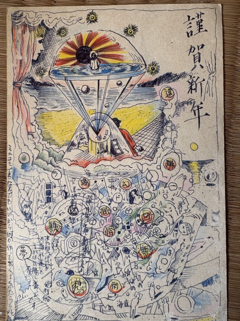 昔の友人 川口喜久雄くんは最近どうしているかな?最近連絡が取れない。忙しいのかな?。この年賀状は私も彼も学生時代の頃だったかな。よく飽きずに微細を描けるなあと感心したもの。