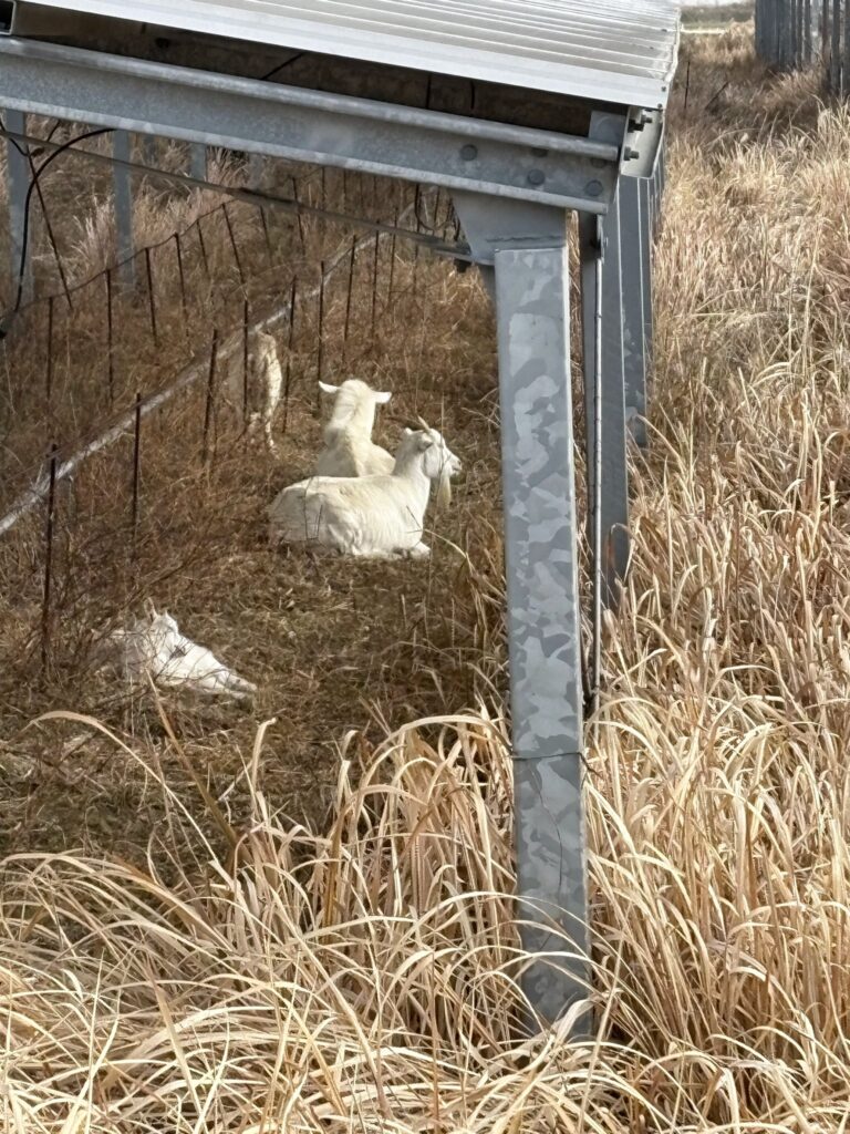 草食べ放題の山羊は昼寝の時間。太陽光発電パネルの下でのんびりしていた。いつも場所を変えてぐるぐるとまわっている様子。時々子山羊が金網をくぐって外へ出ている時がある。子どもはみんなかわいい。大人はどうでも・・