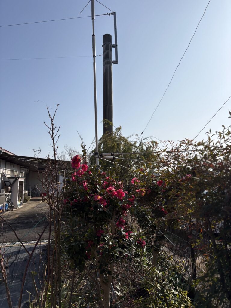 山茶花に囲まれる短波のグランドプレーンアンテナ。まあ殆ど受信専門だから、まあいいっか。側にはつるバラの枝も伸び始めている。アサガオや薔薇の蔦はアンテナがあると巻き付いて安心しているが、爺さんはハラハラしている。時々は使わせて呉れよと願いながら、蔓延った蔦をアンテナから取り外している。