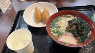さあ呼ばれた、取りに行くが、この寒い冬に水しか選べない、お茶がない。ホントに学食並みだ。仕方ない。でも並うどんの具は満足、肉うどんは680円と180円も高い。庶民は腹さえ満たされればそれで満足。これで十分だ。