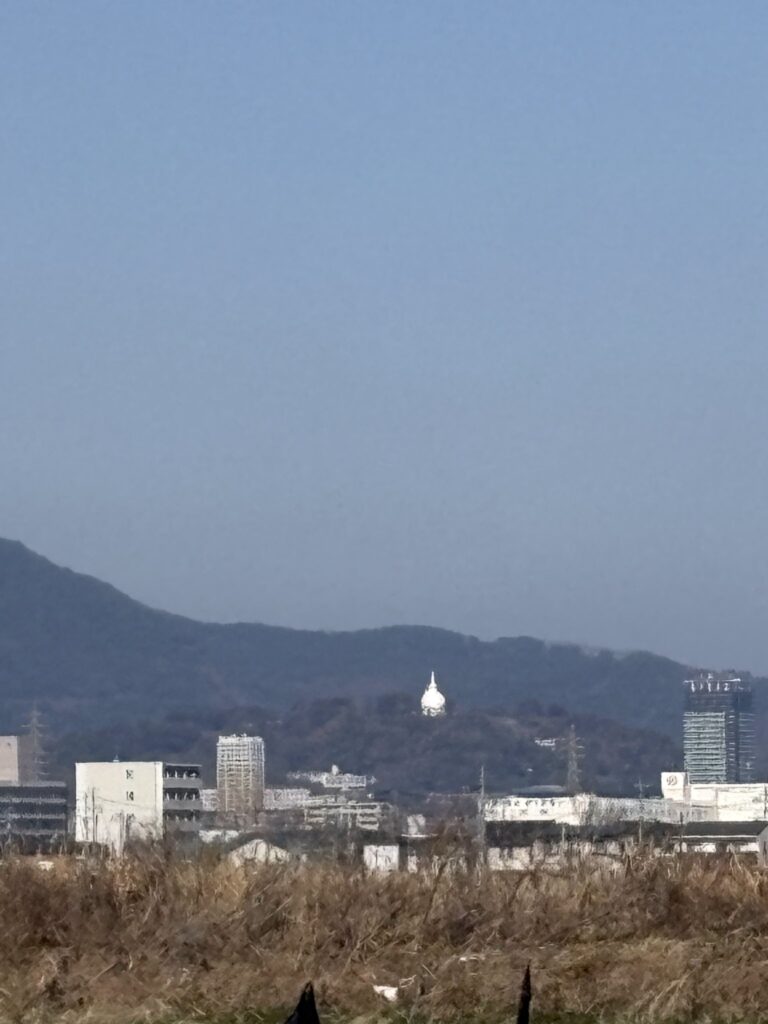朝からの散歩、頬を通り過ぎる風と光が春を感じた。今日は節分明日が立春のはずが今年は今日が立春とか。(地球の公転周期のズレ?)まあ、春が一日早くなって目出度い。金峰山からずっと下へと目を移して花岡山の仏舎利塔が真っ白で目立つ。