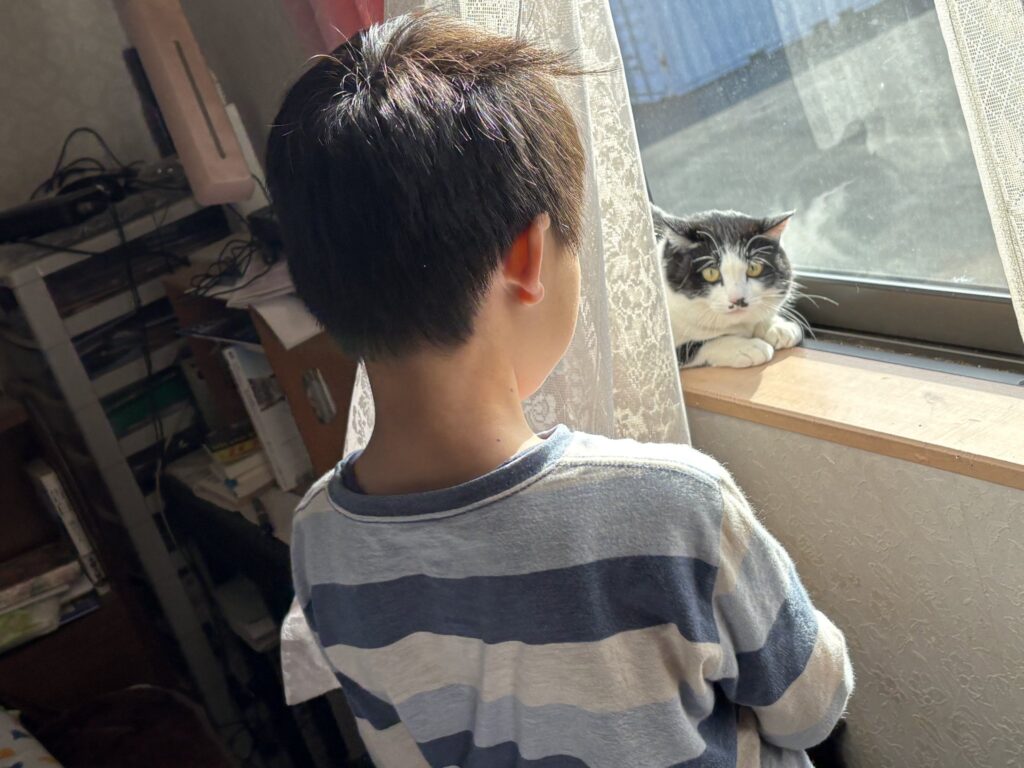 人見知り猫ハナ初めての孫との対面・逃げ出さず、大人になったなあと爺さんはハナを見つめていた。