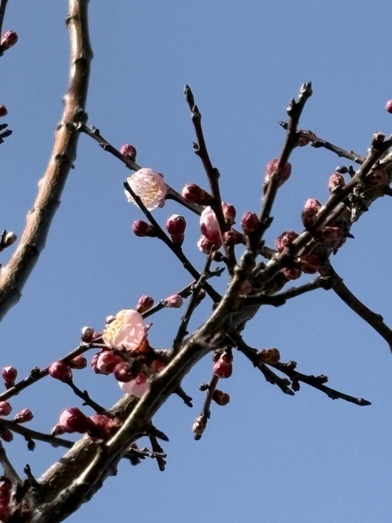紅梅の開花始まった。白梅は既に散り始めたが、やっと紅色の花が開き始めた。今年はちょっと遅い開花だ。梅干しも、梅酒もあと少ししか残っていない。これからちゃんと美味しい実を付けて呉れ給え。とパチリ。