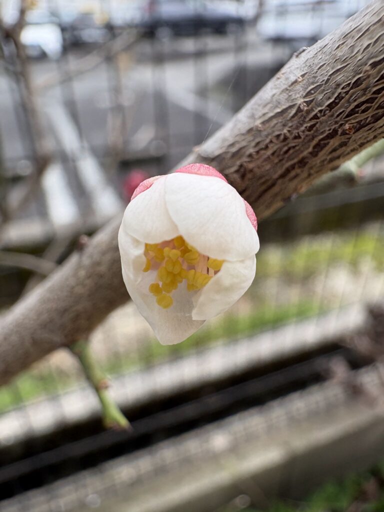 枝から直接花びらが出る白梅があった。世が霞む、今日の世界は別世界のようにして、明日はまた違う世界へ。この梅の花を眺めていると、白く囲まれた花びらの奥に密かに黄色い光が差している。まるで小さな家を外から眺めているような景色だ。なんかこんな言葉の漱石の俳句があったような気がする。COPILOTに聞いてみた。すると・・候補として「梅の奥に誰やら住んで幽かな灯」が浮かんだ。(昔 たしか何かの新聞に載せたのだった)