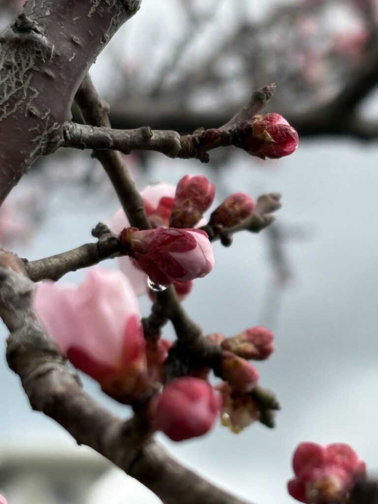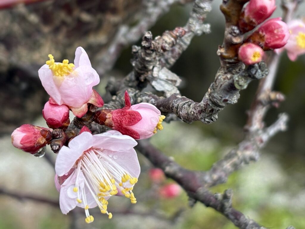 紅梅は 枯れ木の枝に ポツポツと 集まっており ピンクに染まる