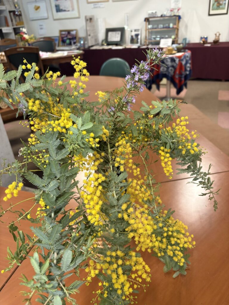 黄色いミモザの花がギャラリーへ移動、毎週持参しているが、そろそろ花も終わる。黄色い水仙といい、どうも花粉色は避けたい。私のこの季節の弱点の花粉症の眼には入れたくない黄色である。