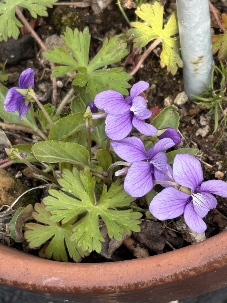 ポットの主賓は薔薇のはずだが、雑草と一緒にある菫が咲いた、今日は日当たり良好、植物はメリハリのつく成長を遂げているが、時折、風に揺れる。
