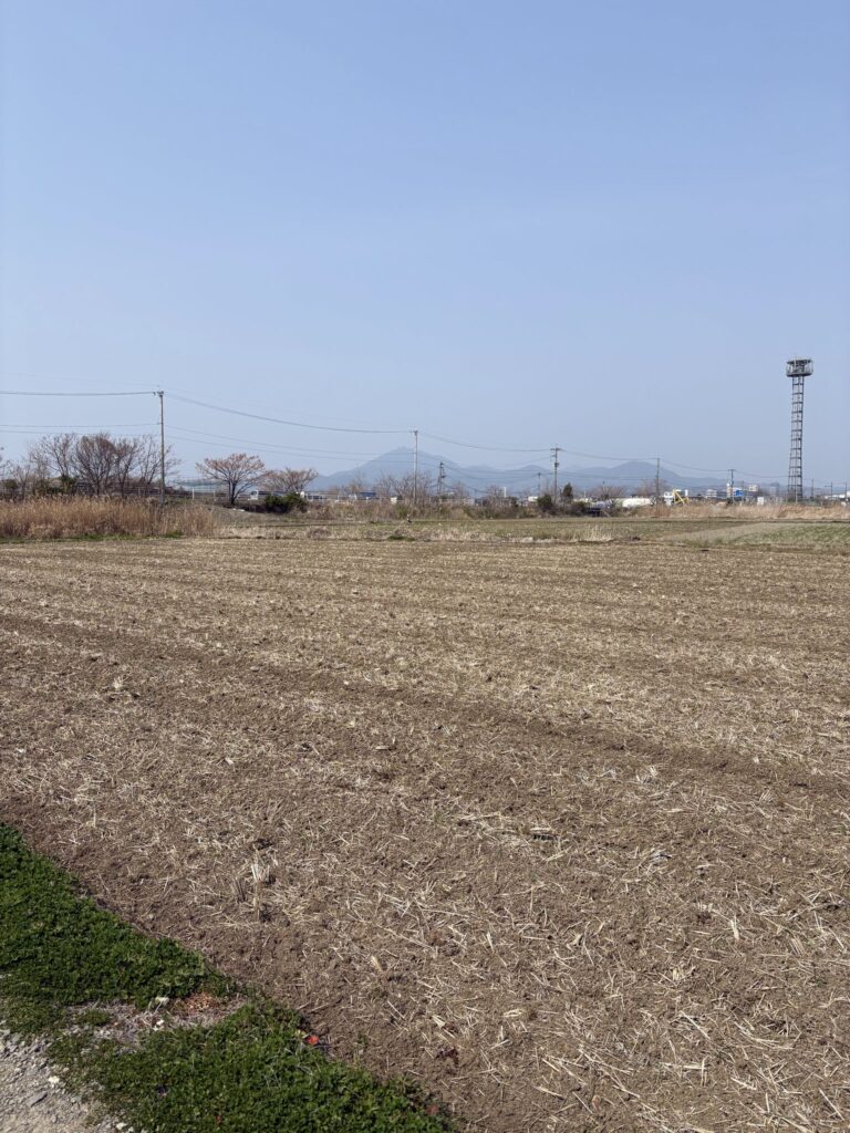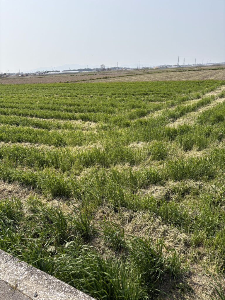 麦だろうか、田んぼいっぱいにあった青い部分の途中がカットされている。緑の部分を勝手に麦と思い込んでいたが、カットされているとなると、違うものだろうか。