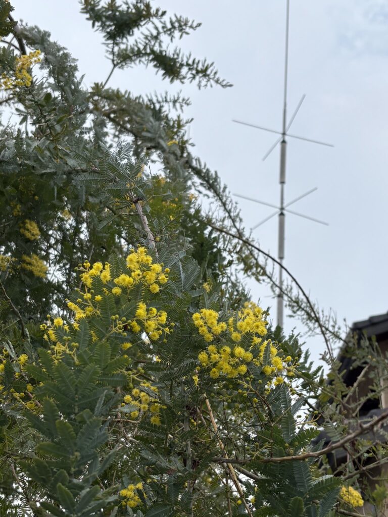 ミモザの黄色い花の向こうのアマチュア無線のアンテナは雨に濡れながら義務的につっ立っている。3.5Mhから50Mhzまでをカバーするグランドプレーン。目下受信専用になっている。時々聞くが寝床の小型のIC705は屋根の上のホイップアンテナで聞く。最近はV・UHFの局も少なくなっていて、狸ワッチの楽しみが少ない。せっかく第一級アマチュア無線技士の免許があっても、100w以上の電波は出したことがない。一度は1KWのアンプを買ったのになあ。アンテナがうまく立てられずにすぐに手放した。無駄な資格と言えばコミュニケーションがうまくないXipociが30年前に得た社会福祉士の免状も駆使する場もなかったなあ。ひっそり壁紙のように、理想を述べたり、書いたりが精一杯だったかな。なんて無駄なことをやっているのだろうって思ったことも。他にもいろんな資格をとったなあ、放射線技師の職場では放射線管理士やら、まだまだ資格たちが追いかけてきたが、勉強嫌いの爺さんにとっては仕事を早く切り上げたのは幸いだった。