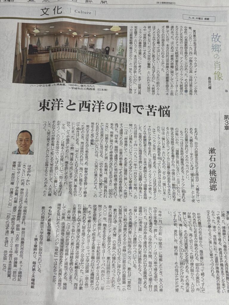 今日は第二木曜。熊日新聞で櫂さんが連載の「故郷の肖像」-漱石の桃源郷- を書いている。この前文で米国、トランプの評価がある。ベネズエラの事は、駄目と言う的確な評価だ。普通の俳人は政治からかなり遠くにあることが多いがスカッとする言葉だった。それは私達が思うことと一致している。評論の内容には関係ないが、後半部に宇土半島を一周したことが書かれている。この車の運転手が私である。(^o^)・・俳人は風景を口にしながら、あれはそれと文章で帰結する。