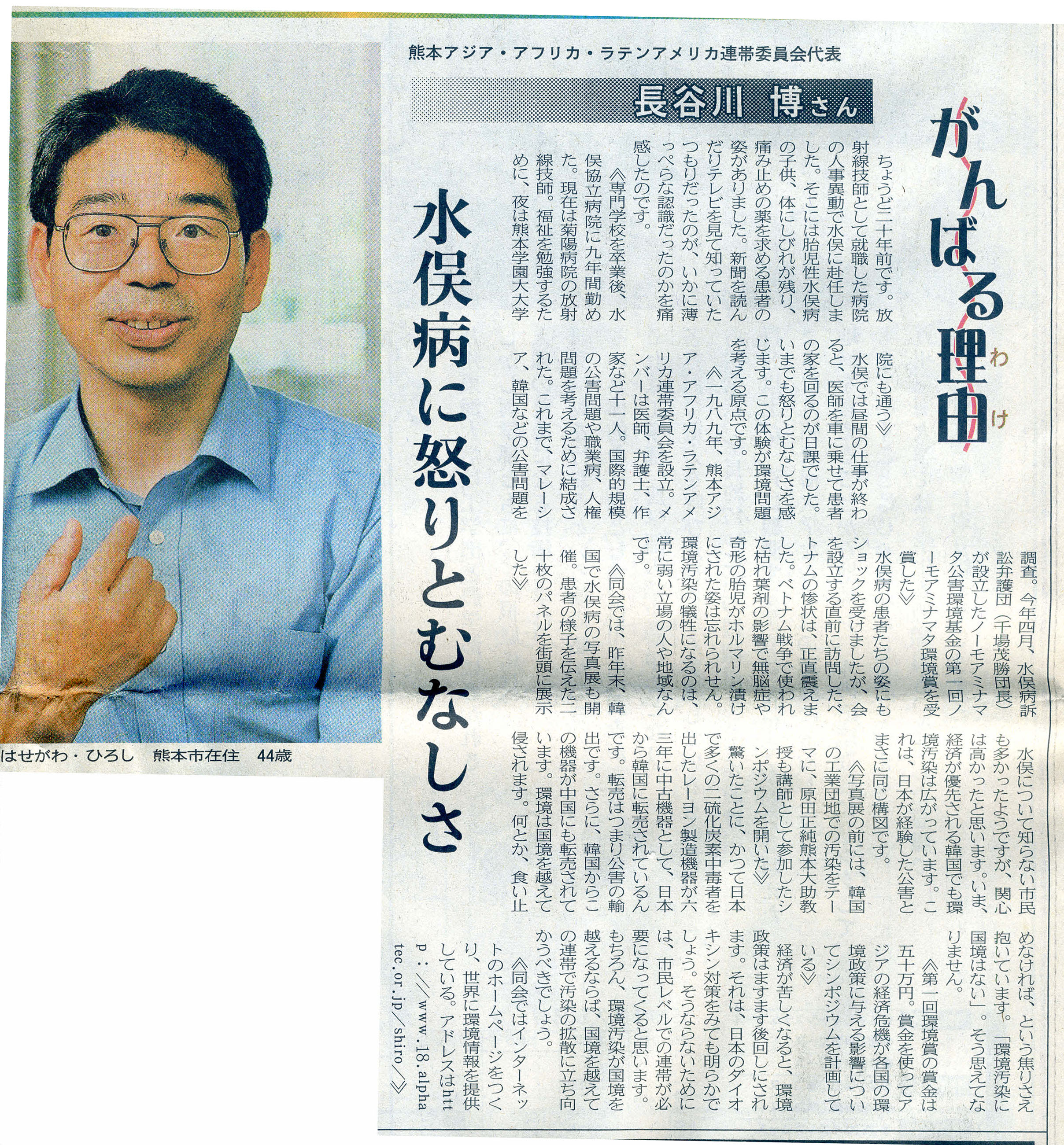 1998年8月16日熊日記事 | AALAの活動報告;北岡秀郎さんが韓国で水俣病写真展をした。 また産災・公害シンポをソウルで実施したり。その中心のメンバ ーがハンセン病や川辺川ダム問題で活躍し始めた頃、AALAでの 集まりが段々出来がたくなってきた。気持ちだけはなんとかしなく てはと思っていたのではあるが・・ホームページもプロバイダー がなくなって消えてしまったのも痛い。(^^;) |