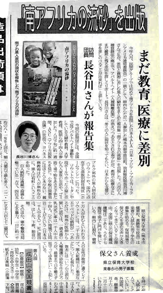 〇1991年11月30日読売新聞(熊本)p23 「南アフリカの流砂」を出版 まだ教育、医療に差別 〇熊本民報にも南ア情勢を 1991年12月から連載 pdfに変換時、字体がおかしくなった部分や欠損は想像 してお読みください。 |